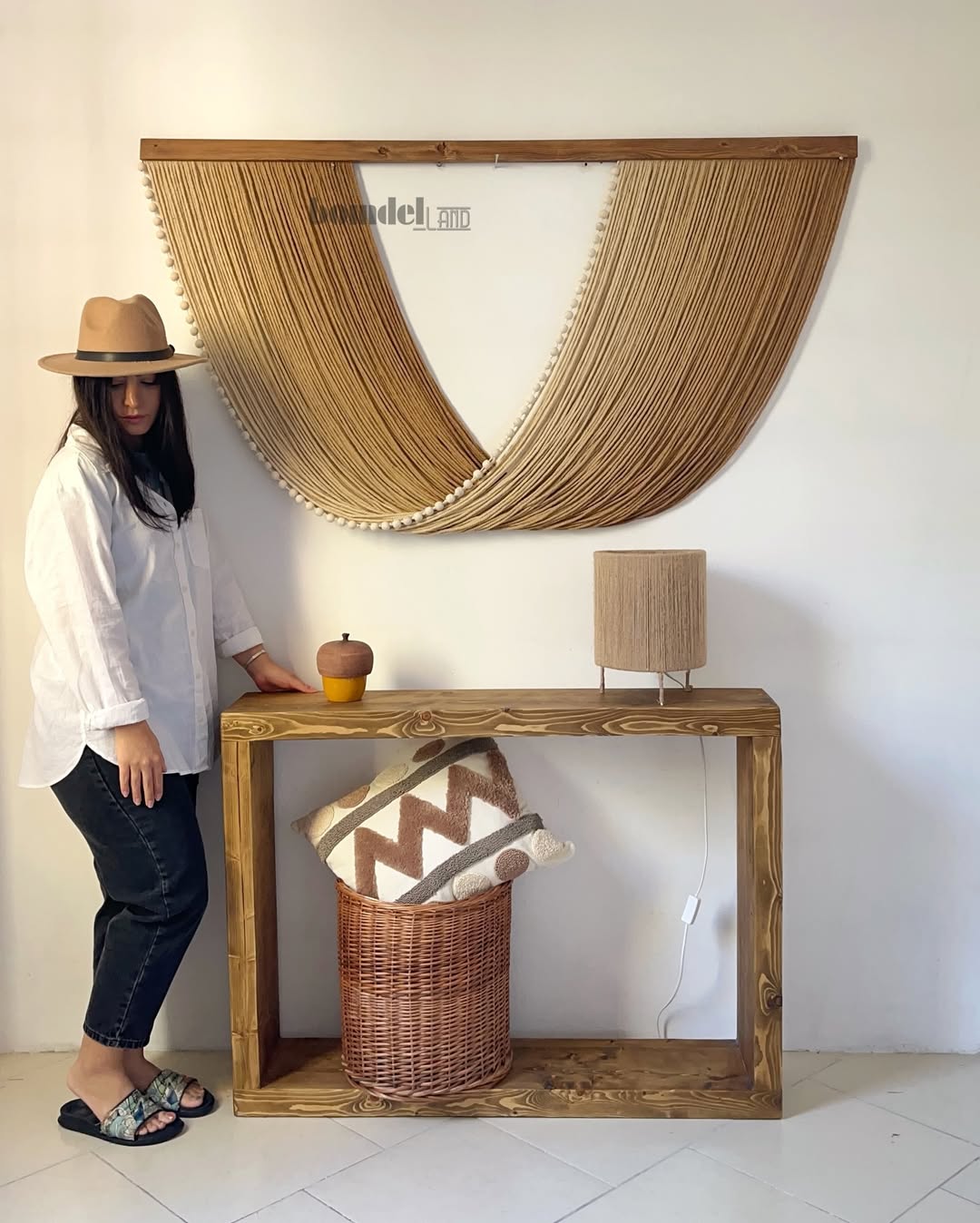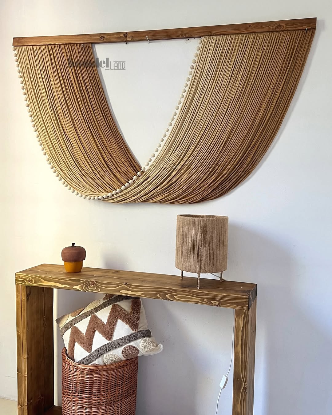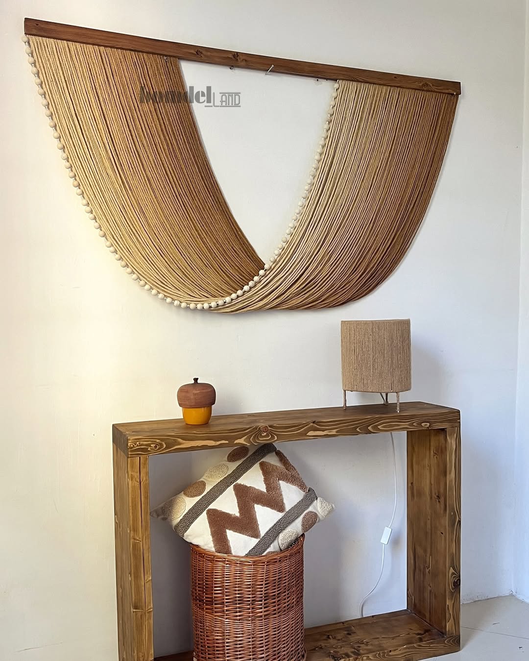 تابلو دستساز کار شده با الیاف نخ پنبه طبیعی رنگرزی شده و چوب روس و مهره چوبی با طول ۱۵۰ سانتی متر و ارتفاع ۸۰ سانتی متر زمان آماده سازی و ارسال ۱۵ الی ۲۵ روز کاری