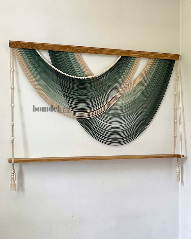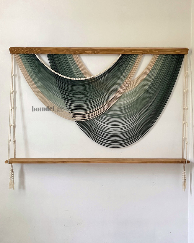 دیوارکوب شلف دار دستساز کار شده با الیاف نخ پنبه رنگرزی شده و چوب روس و مهره چوبی