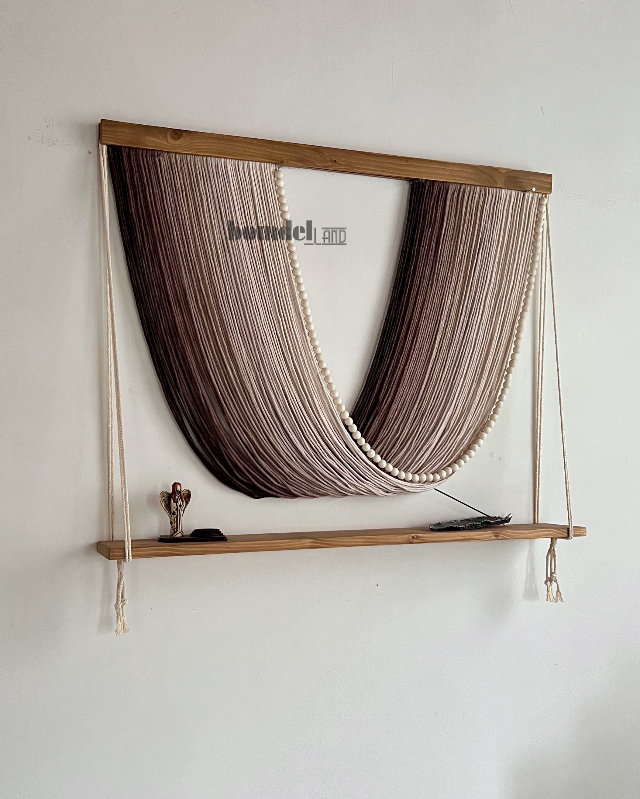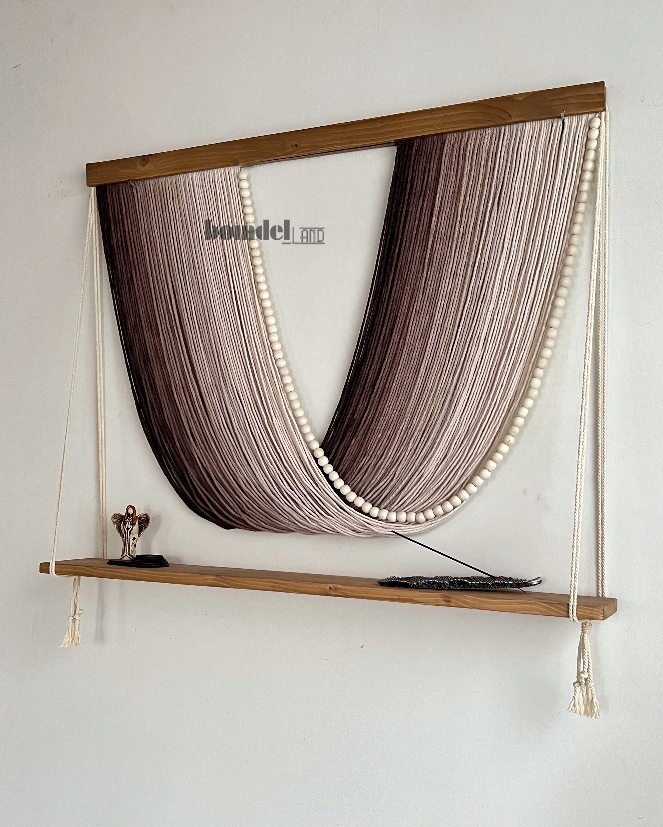 دیوارکوب دستساز کار شده با الیاف رنگرزی شده و چوب روس و مهره ی چوبی با طول ۱۰۰ سانتی متر و ارتفاع ۸۵ سانتی متر زمان آماده سازی و ارسال ۱۵ الی ۲۵ روز کاری