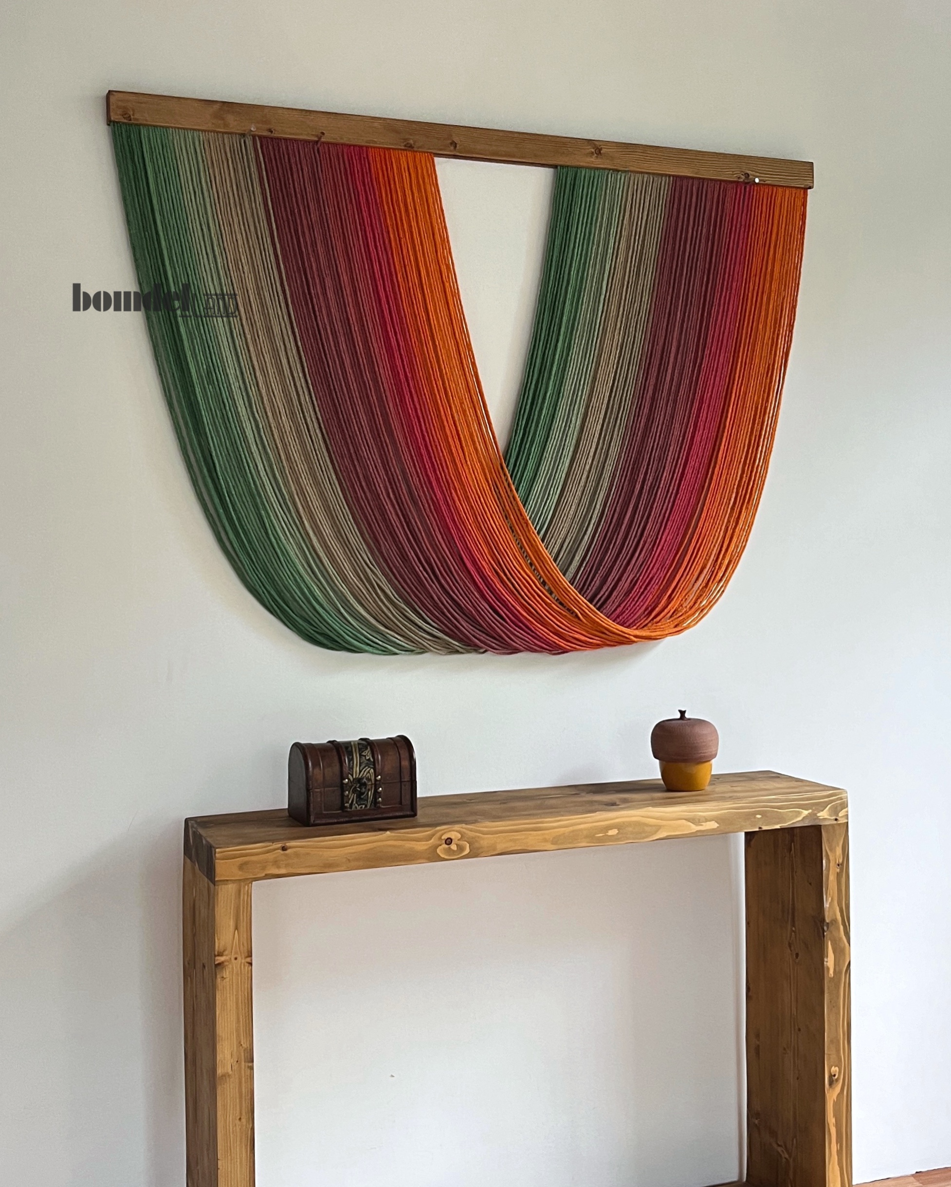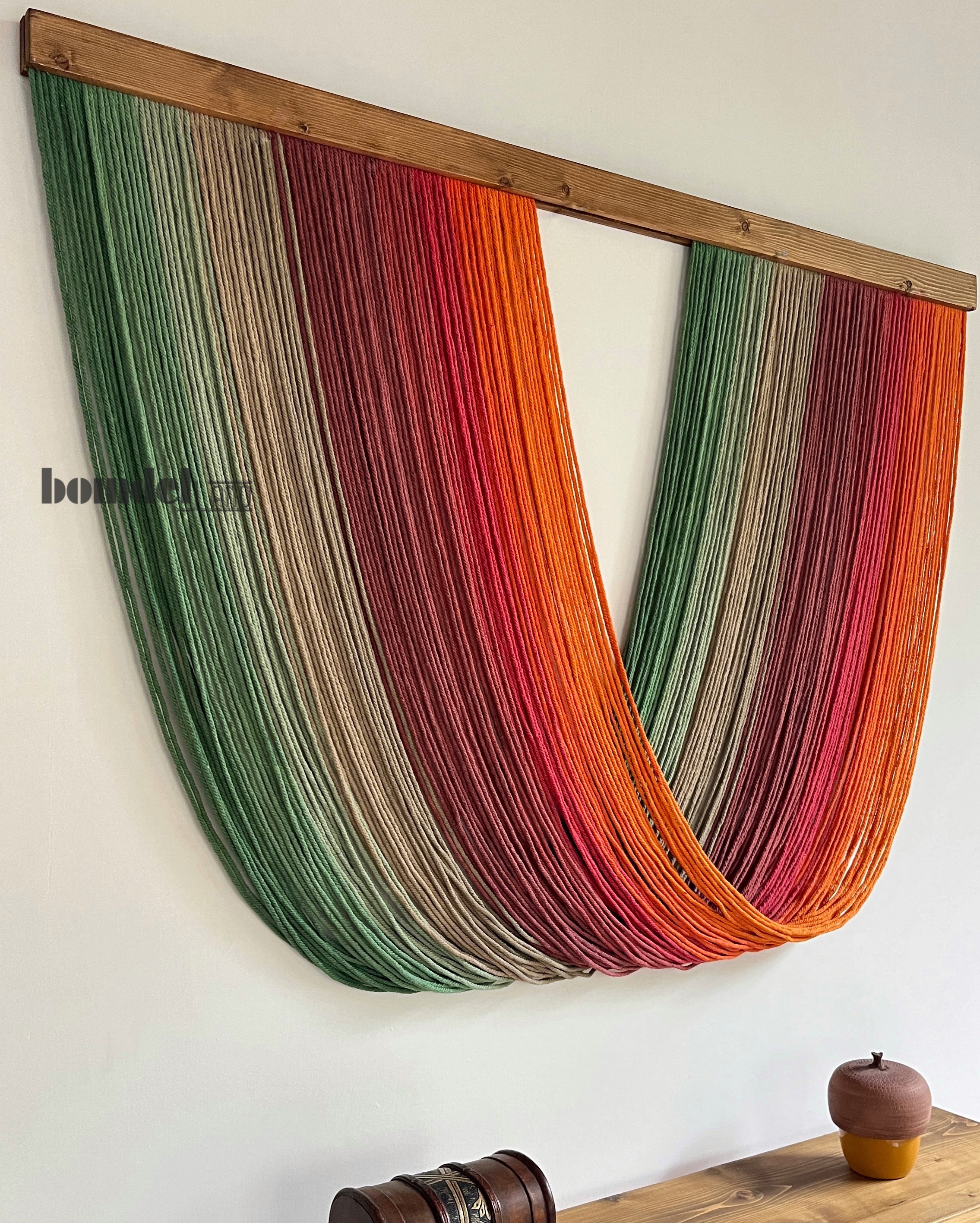 دیوارکوب دستساز کار شده با الیاف نخ پنبه طبیعی رنگرزی شده و چوب روس با طول ۱۳۰ سانتی متر و ارتفاع ۹۰ سانتی متر زمان آماده سازی و ارسال ۱۵ الی ۲۵ روز کاری