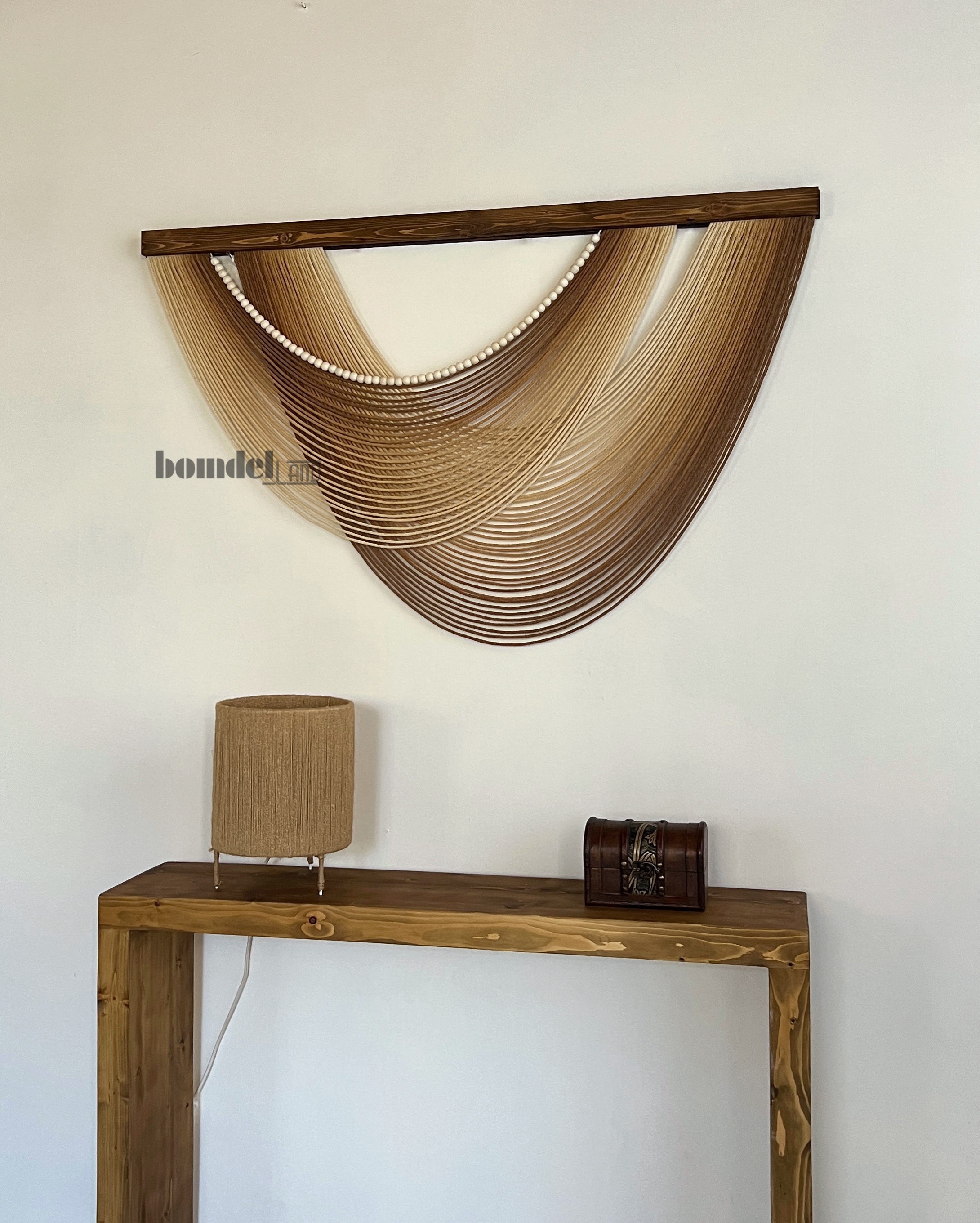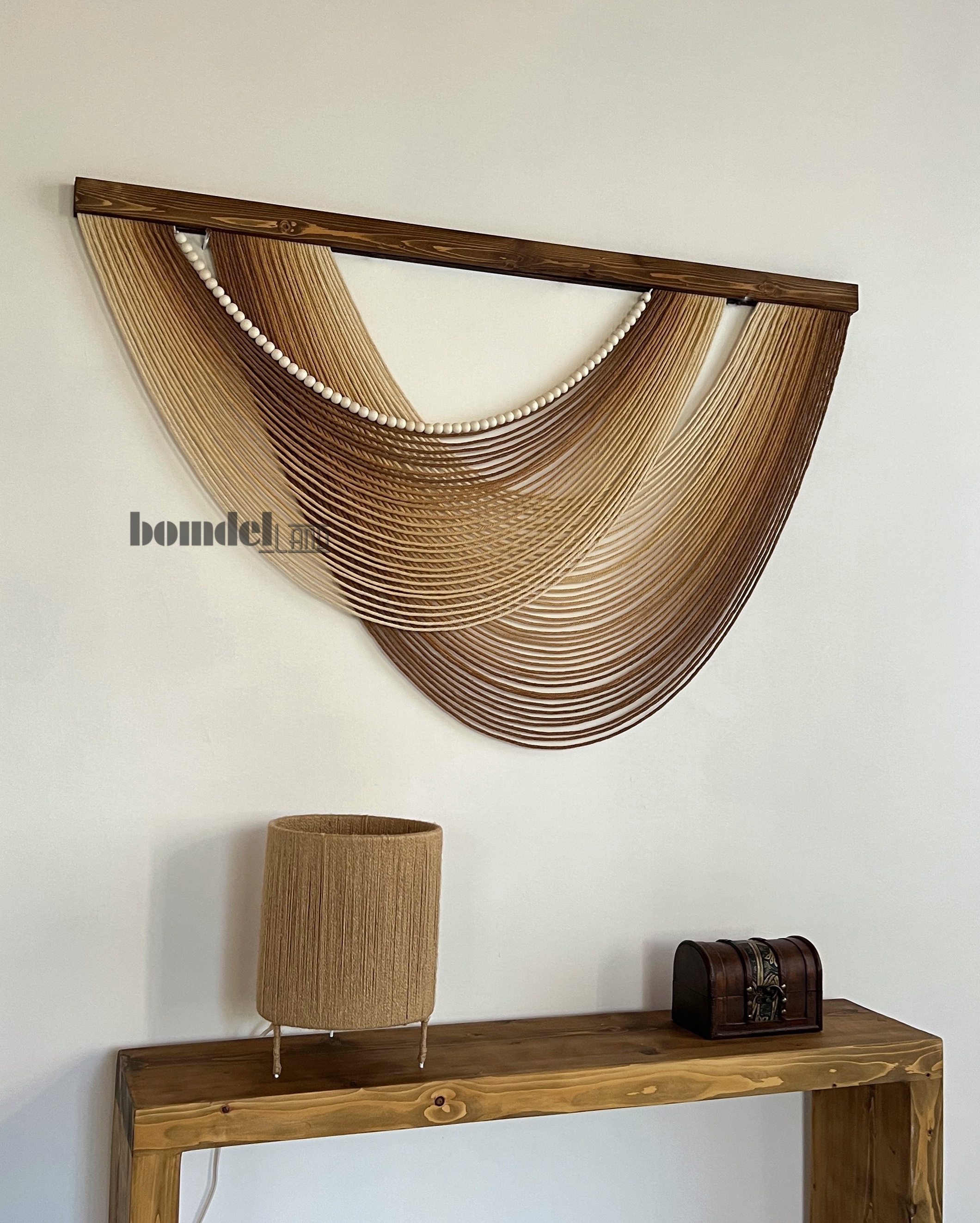 دیوارکوب دستساز کار شده با الیاف رنگرزی شده و چوب روس و مهره ی چوبی با طول ۱۲۰ سانتی متر و ارتفاع ۷۵ سانتی متر زمان آماده سازی و ارسال ۱۵ الی ۲۵ روز کاری