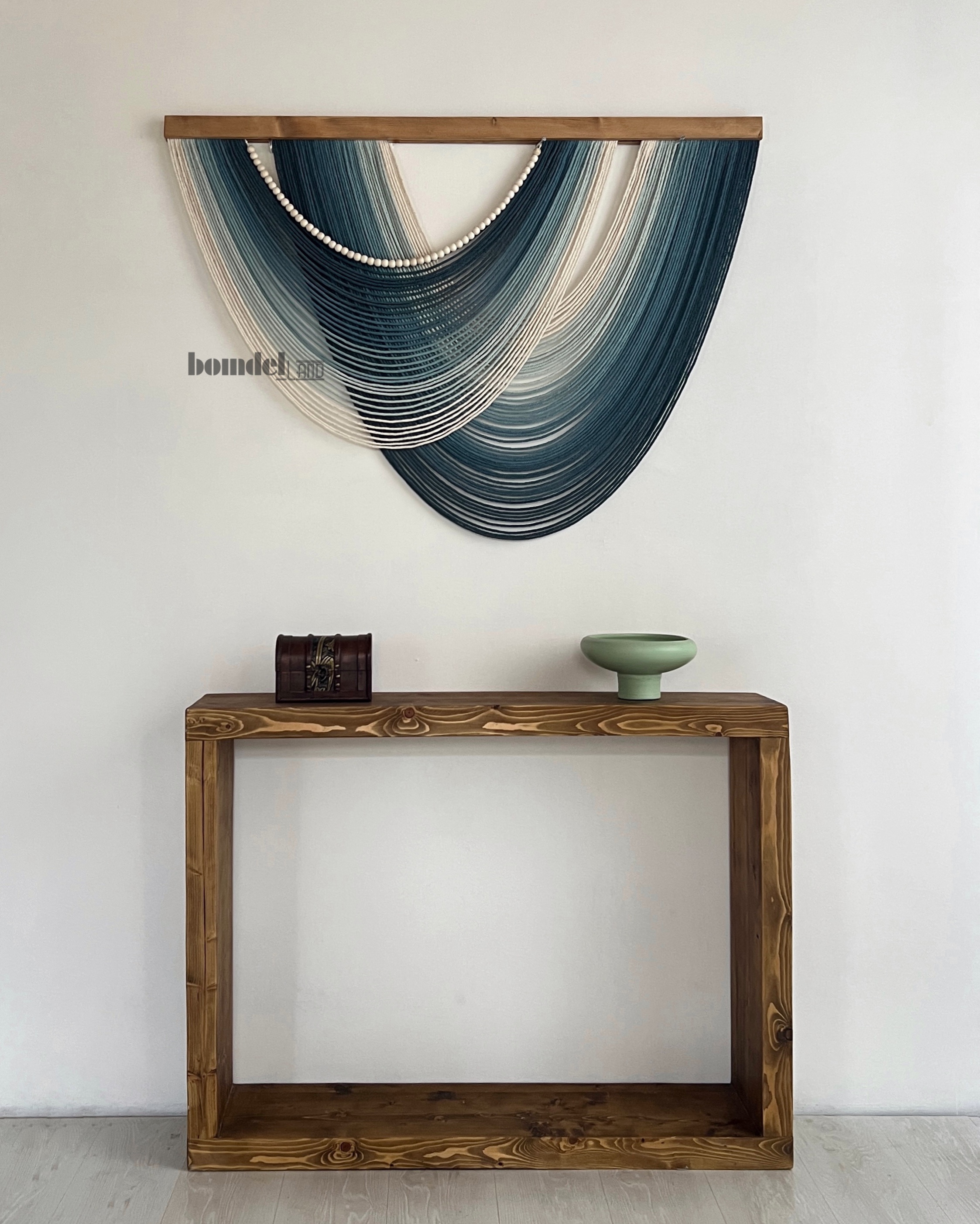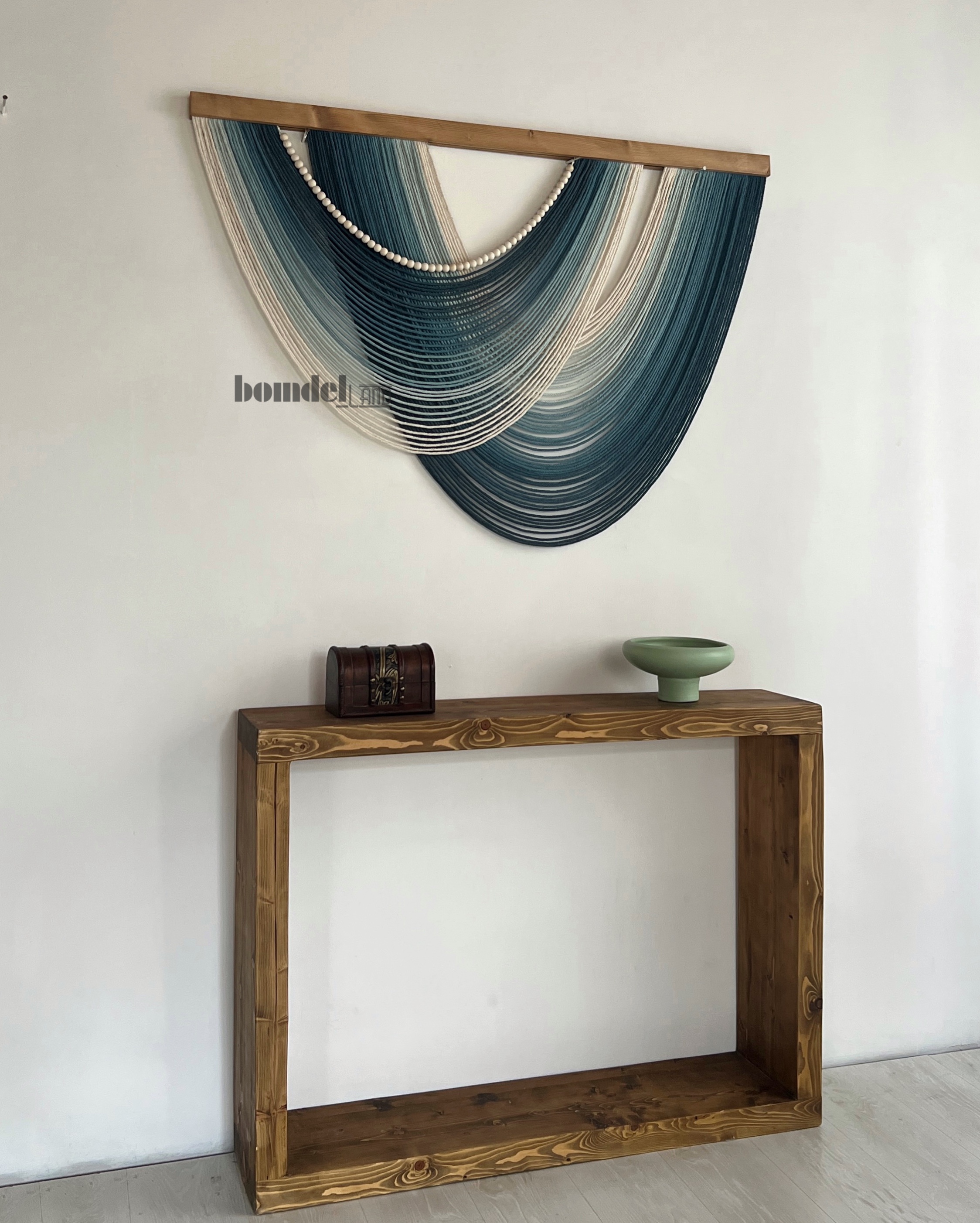 کار شده با الیاف رنگرزی شده و چوب روس و مهره ی چوبی با طول ۱۲۰ سانتی متر و ارتفاع ۸۵ سانتی متر موجود و آماده ی ارسال