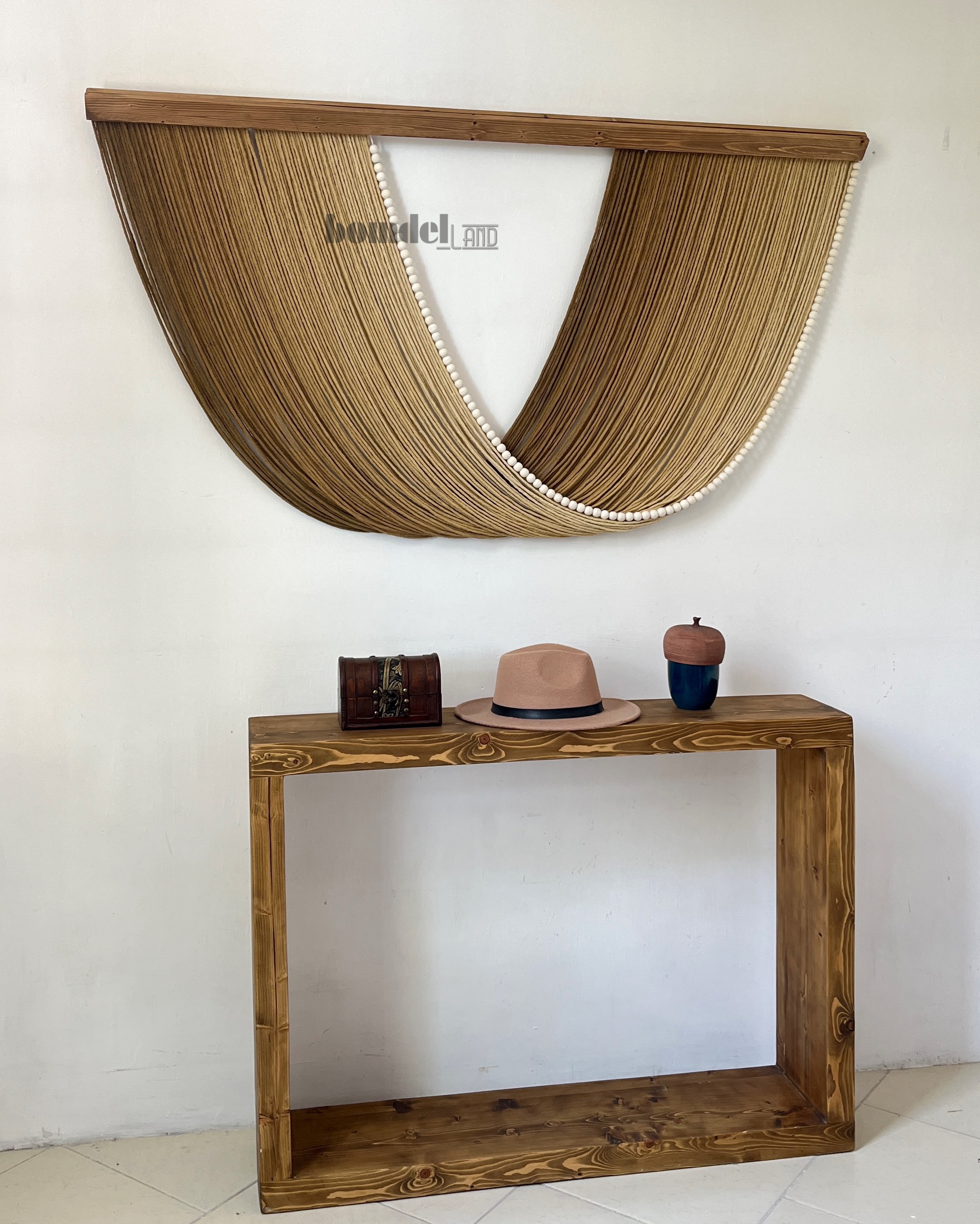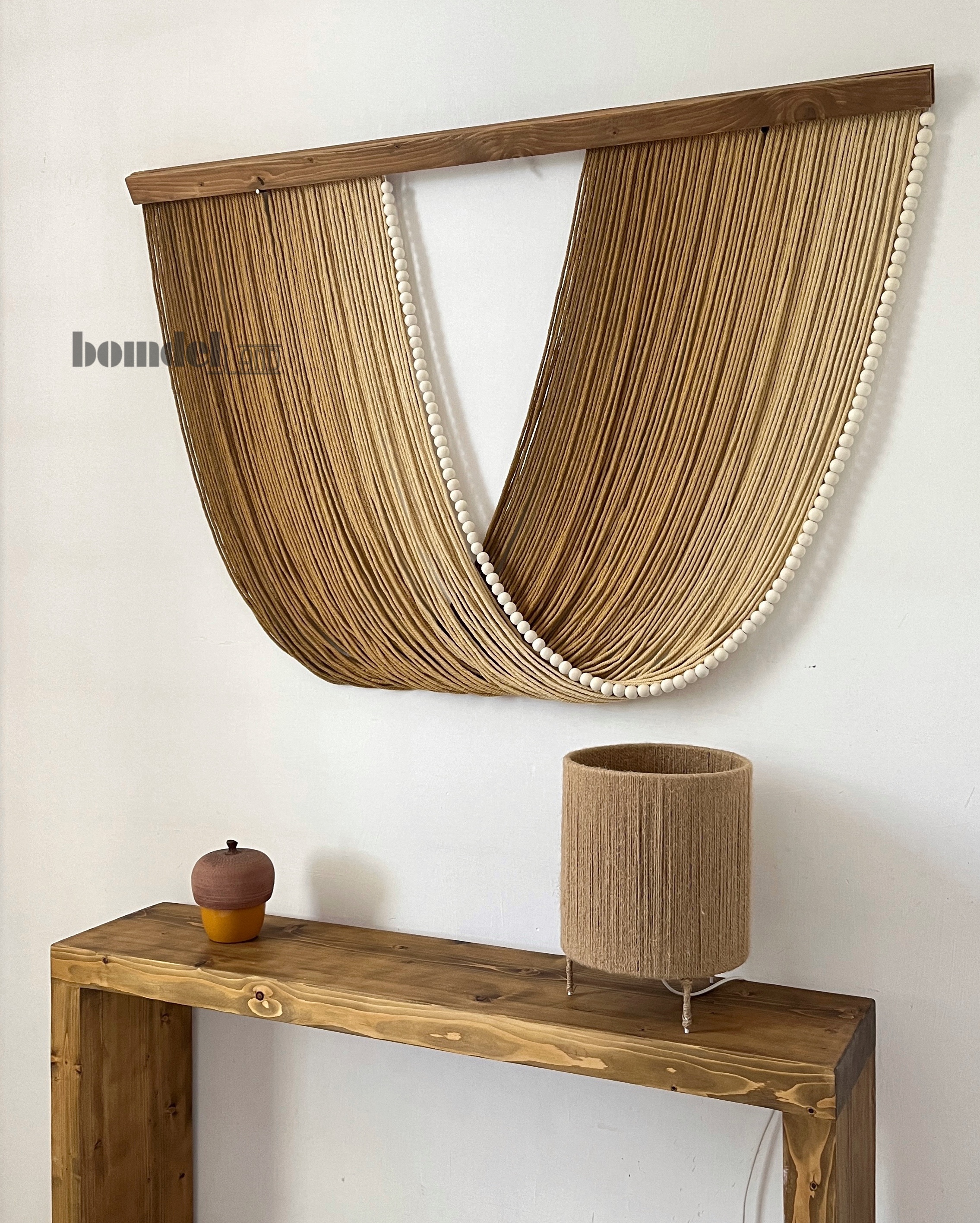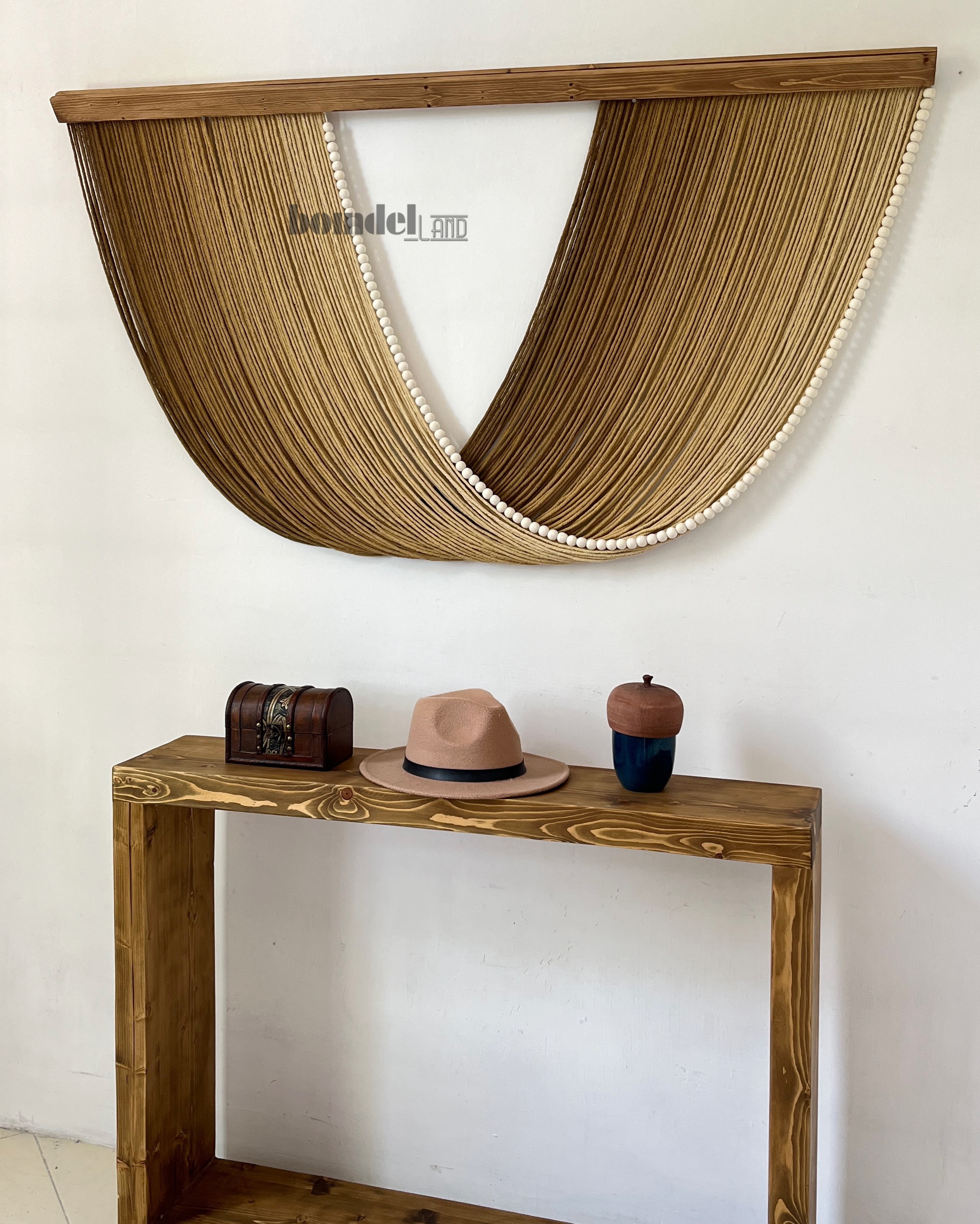 تابلو دیوارکوب کار شده با الیاف نخ پنبه رنگرزی شده و چوب روس و مهره ی چوبی زمان آماده سازی و ارسال ۱۵ الی ۲۵ روز کاری