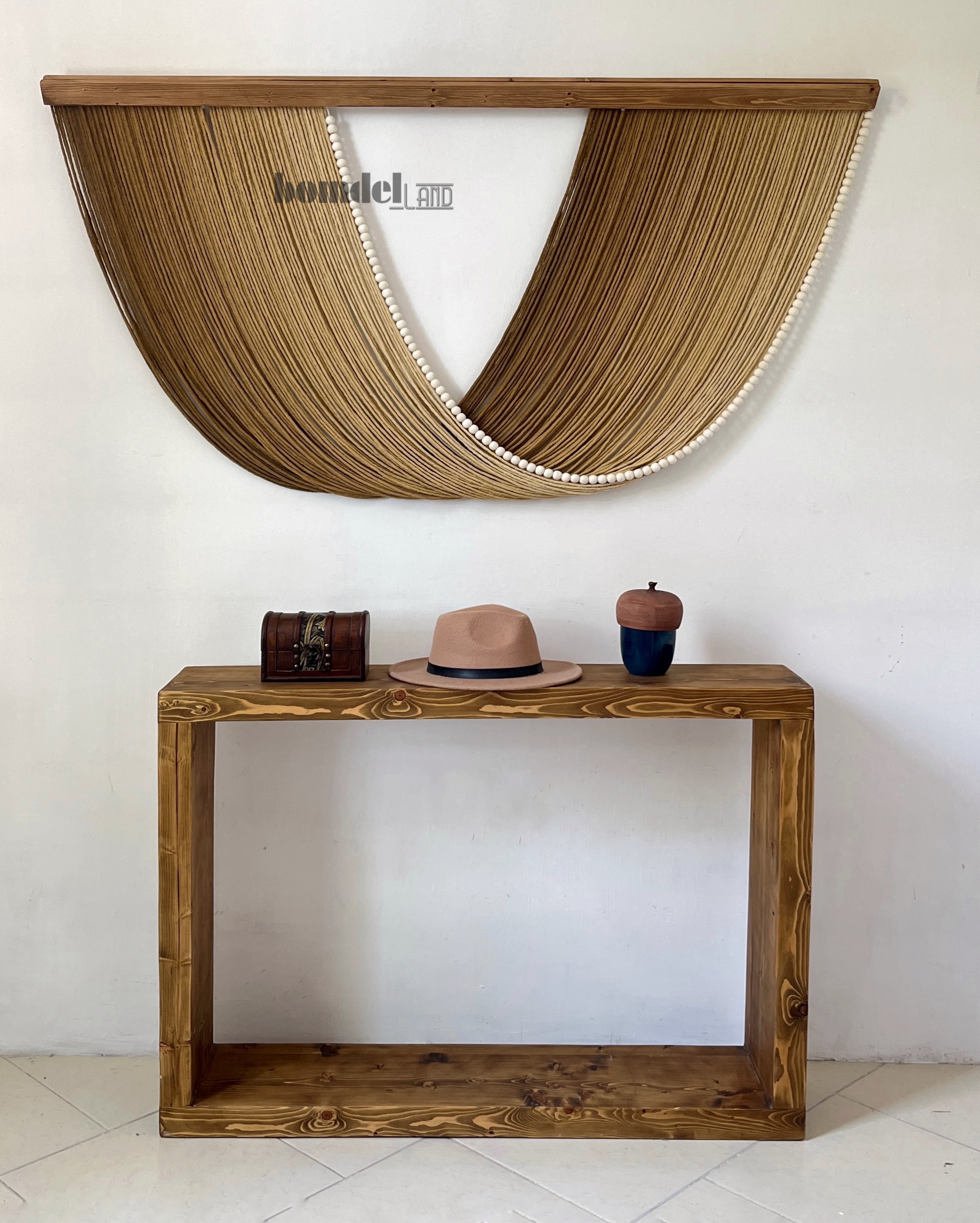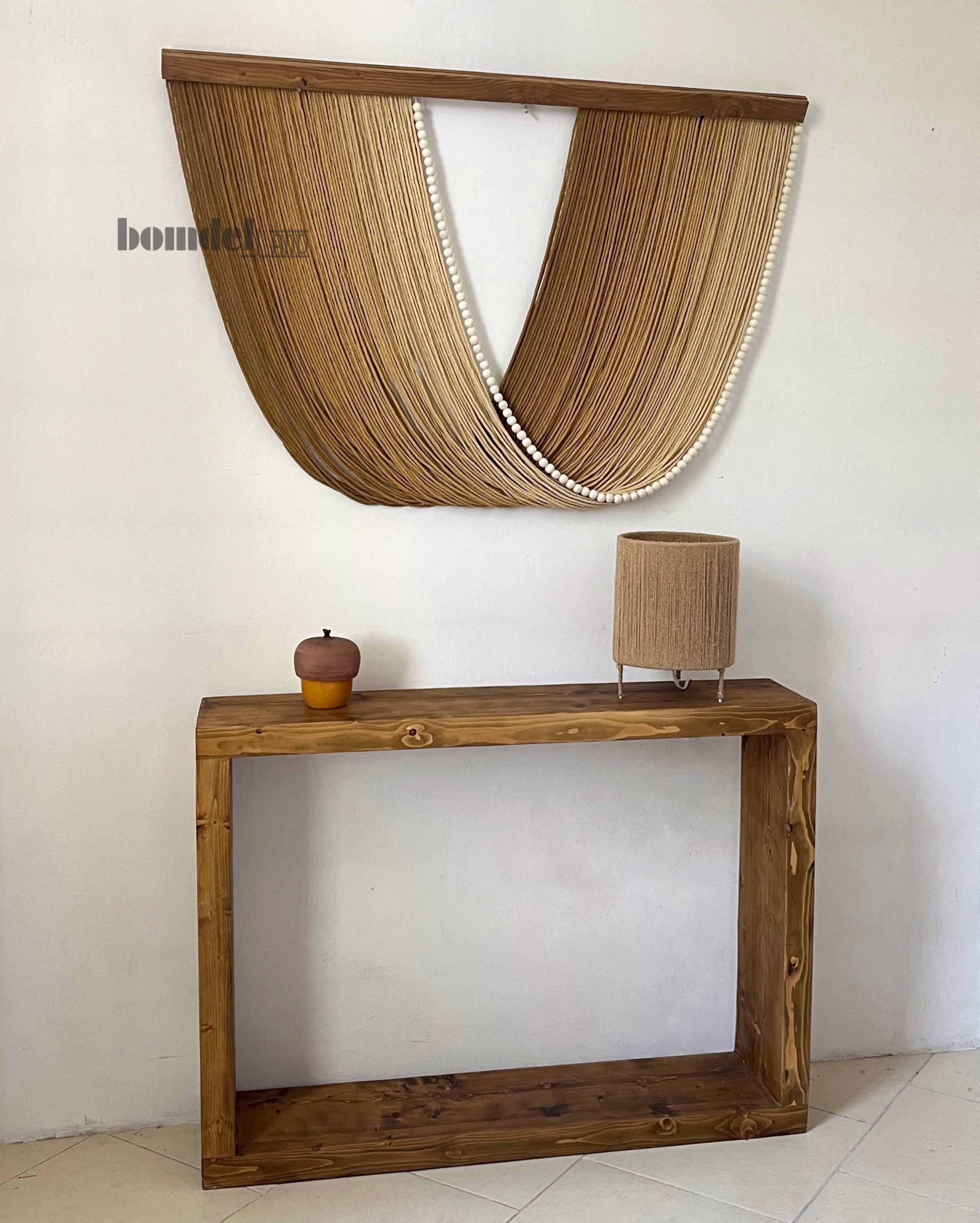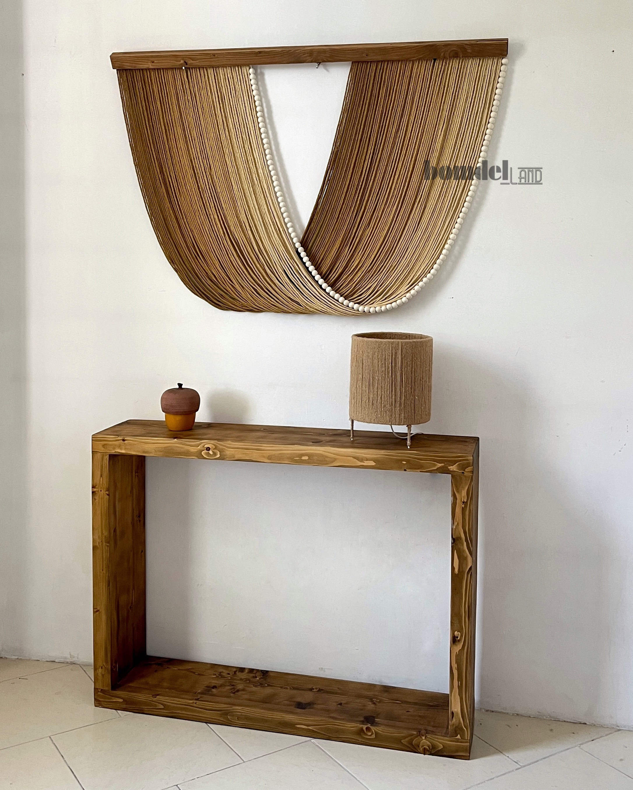 تابلو دیوارکوب کار شده با الیاف نخ پنبه رنگرزی شده و چوب روس و مهره ی چوبی زمان آماده سازی و ارسال ۱۵ الی ۲۵ روز کاری