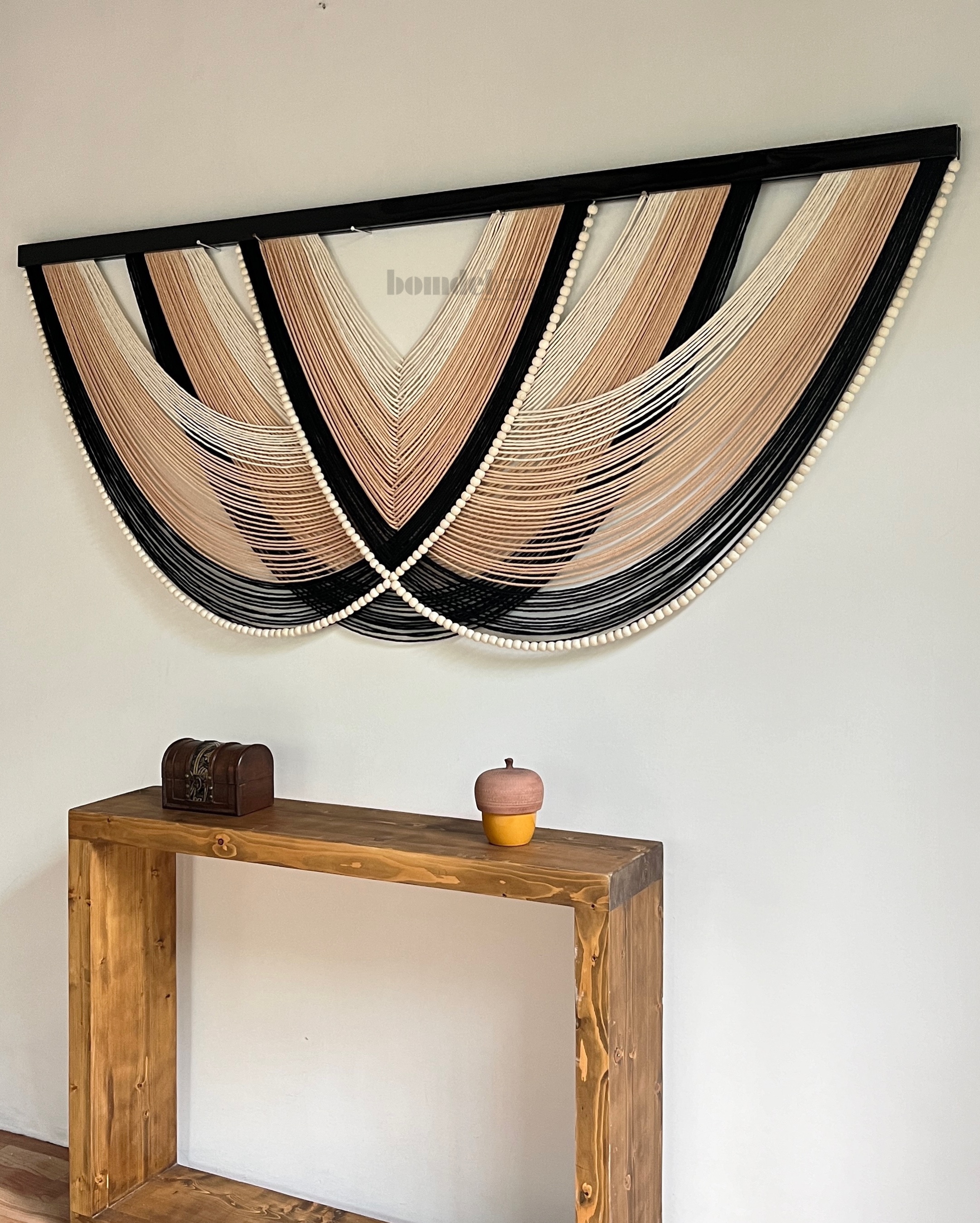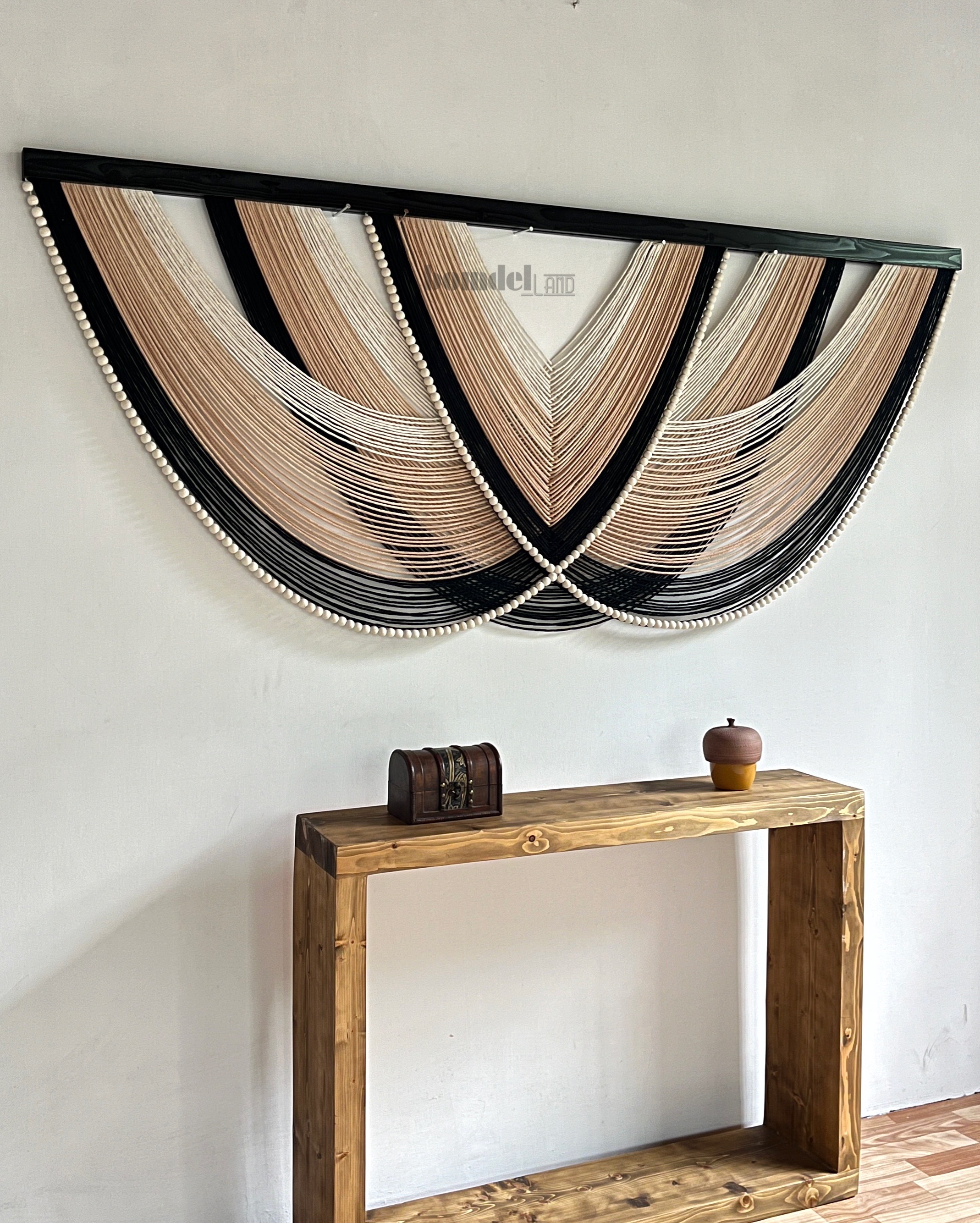 دیوارکوب کار شده با الیاف رنگرزی شده و چوب روس مشکی و مهره چوبی با طول ۲۰۰ سانتی متر و ارتفاع ۸۵ سانتی متر موجود و آماده ی ارسال