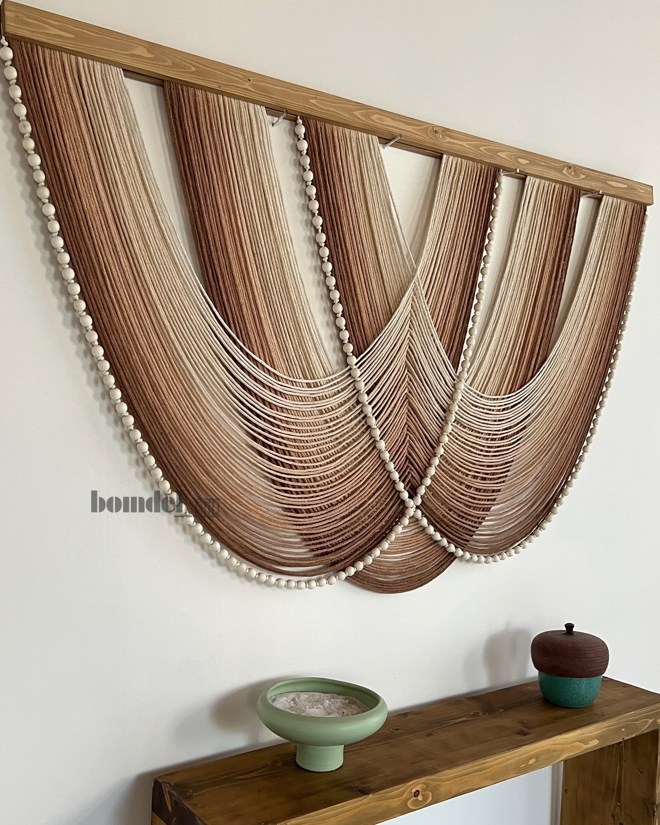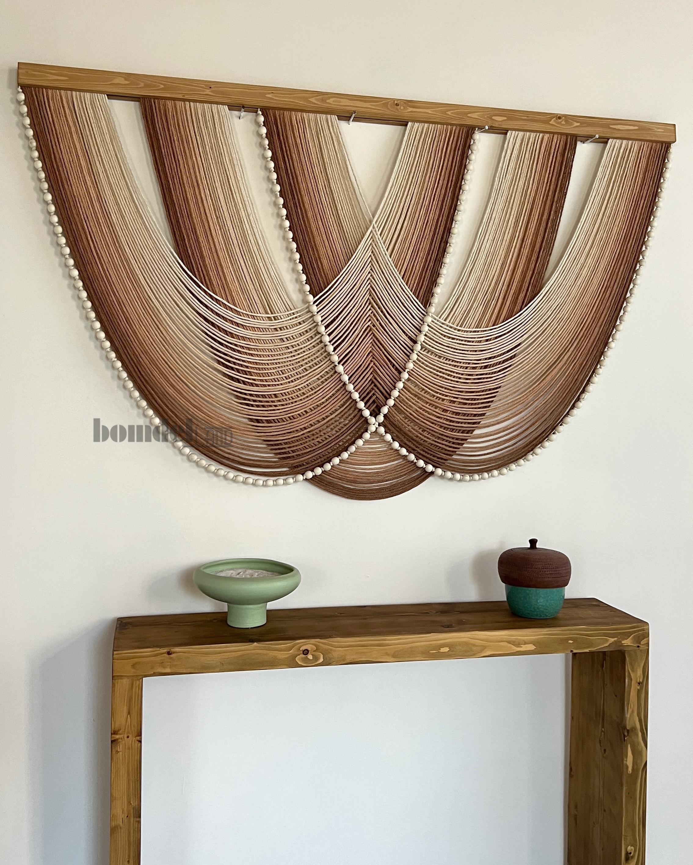 کار شده با الیاف نخ پنبه طبیعی رنگرزی شده و چوب روس و مهره ی چوبی
