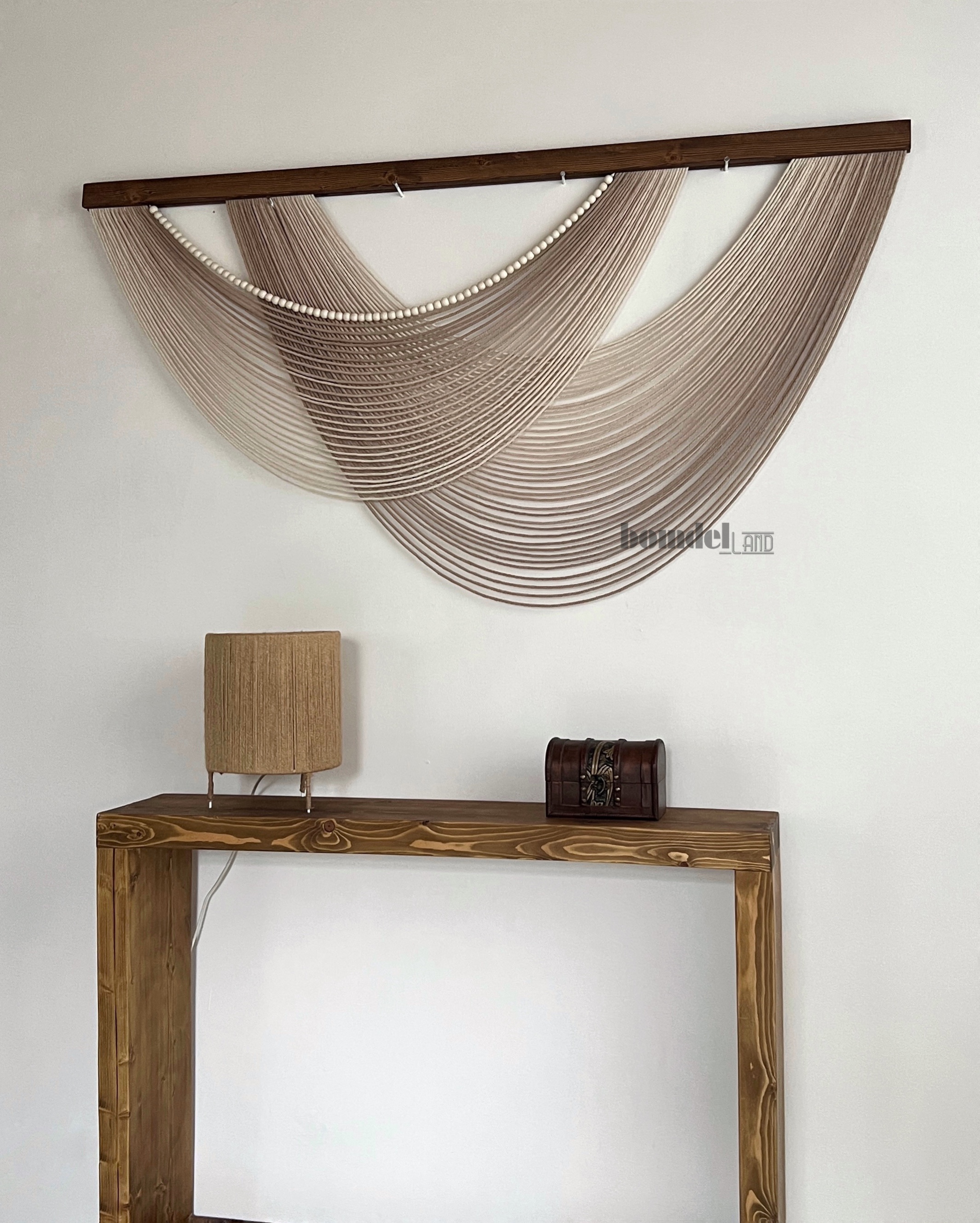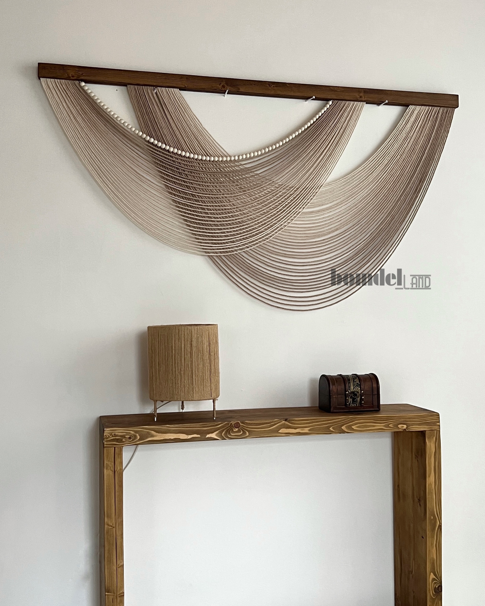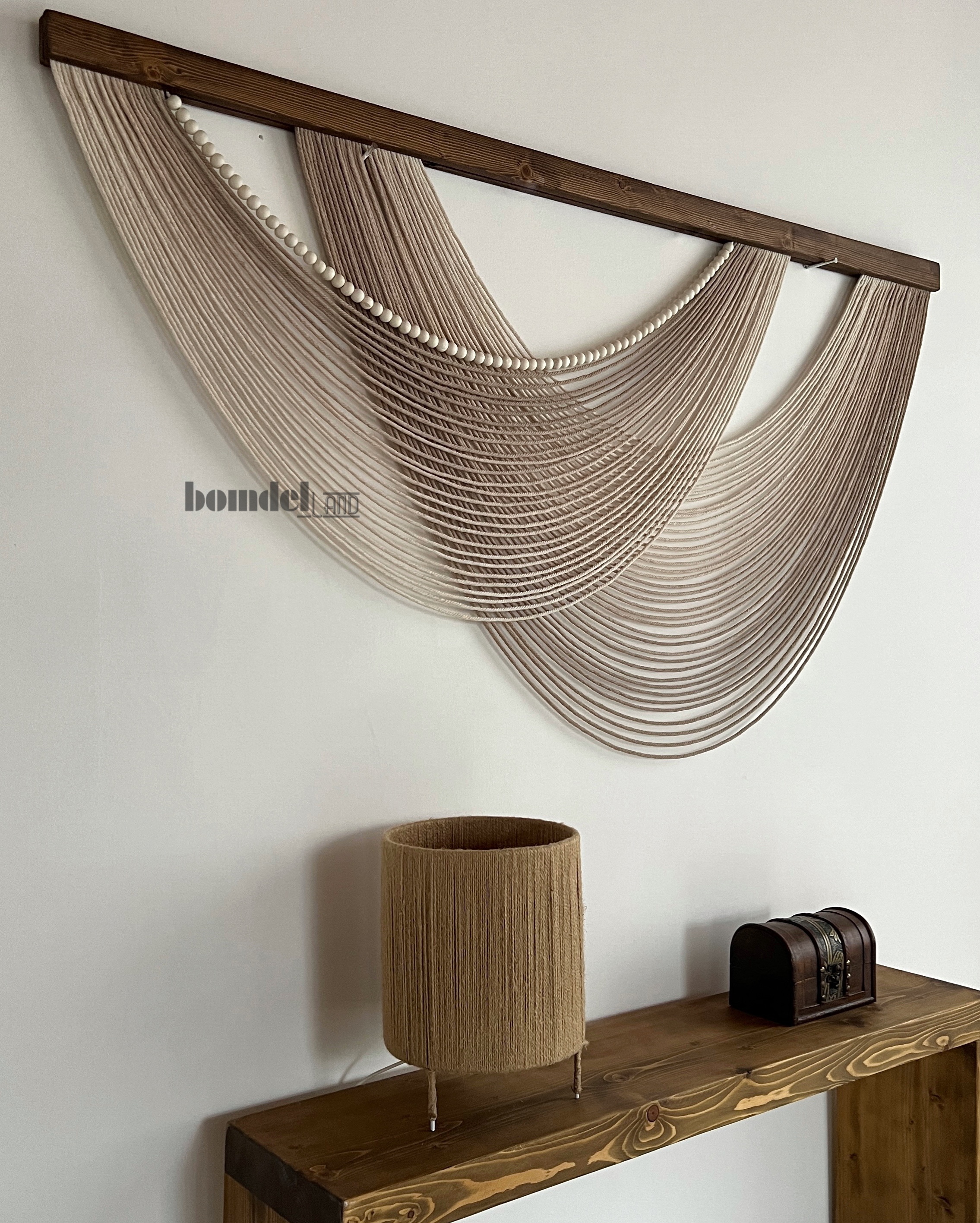 دیوارکوب کار شده با الیاف نخ پنبه رنگرزی شده و چوب روس و مهره ی چوبی