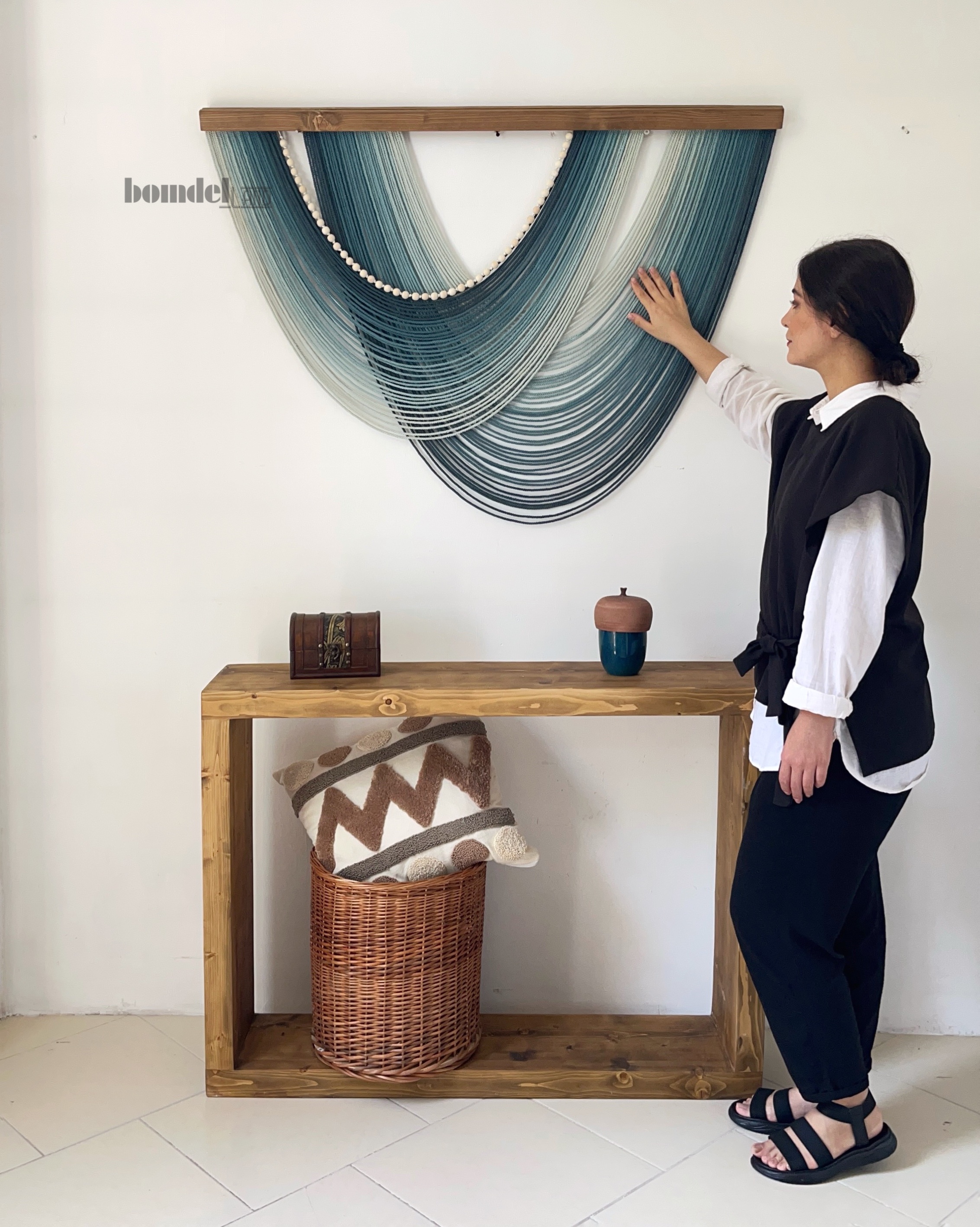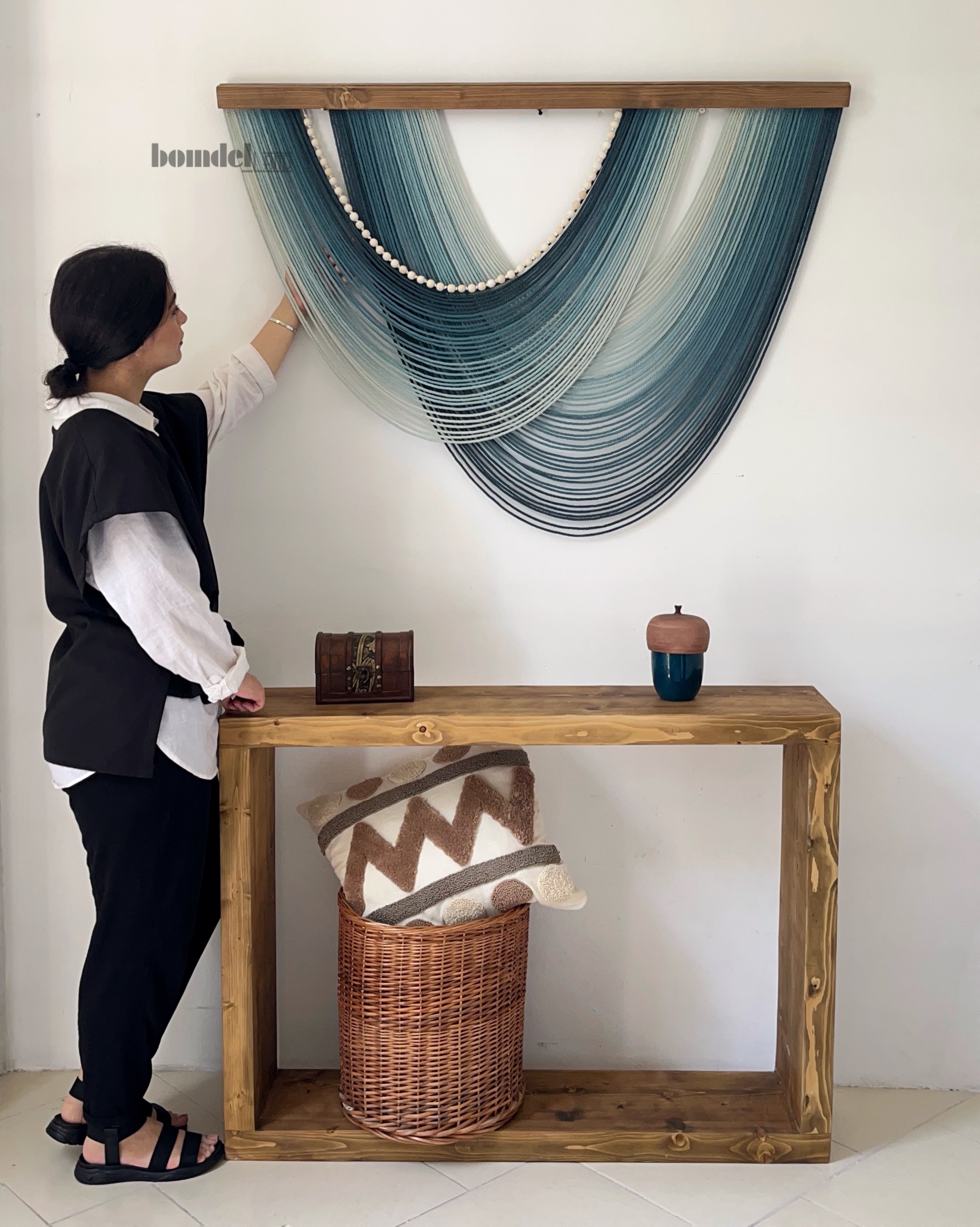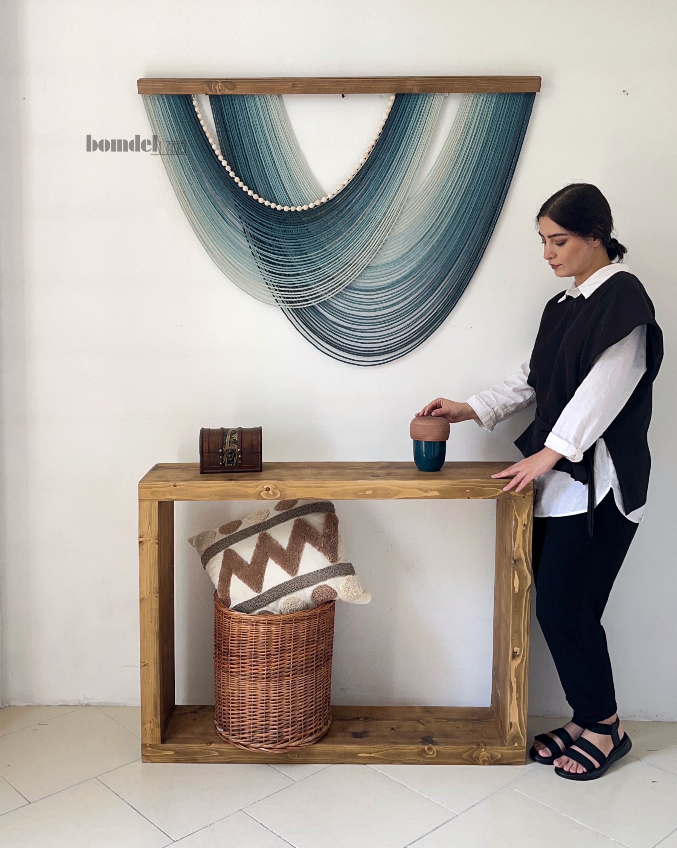 تابلو دستساز کار شده با الیاف رنگرزی شده و چوب روس و مهره ی چوبی