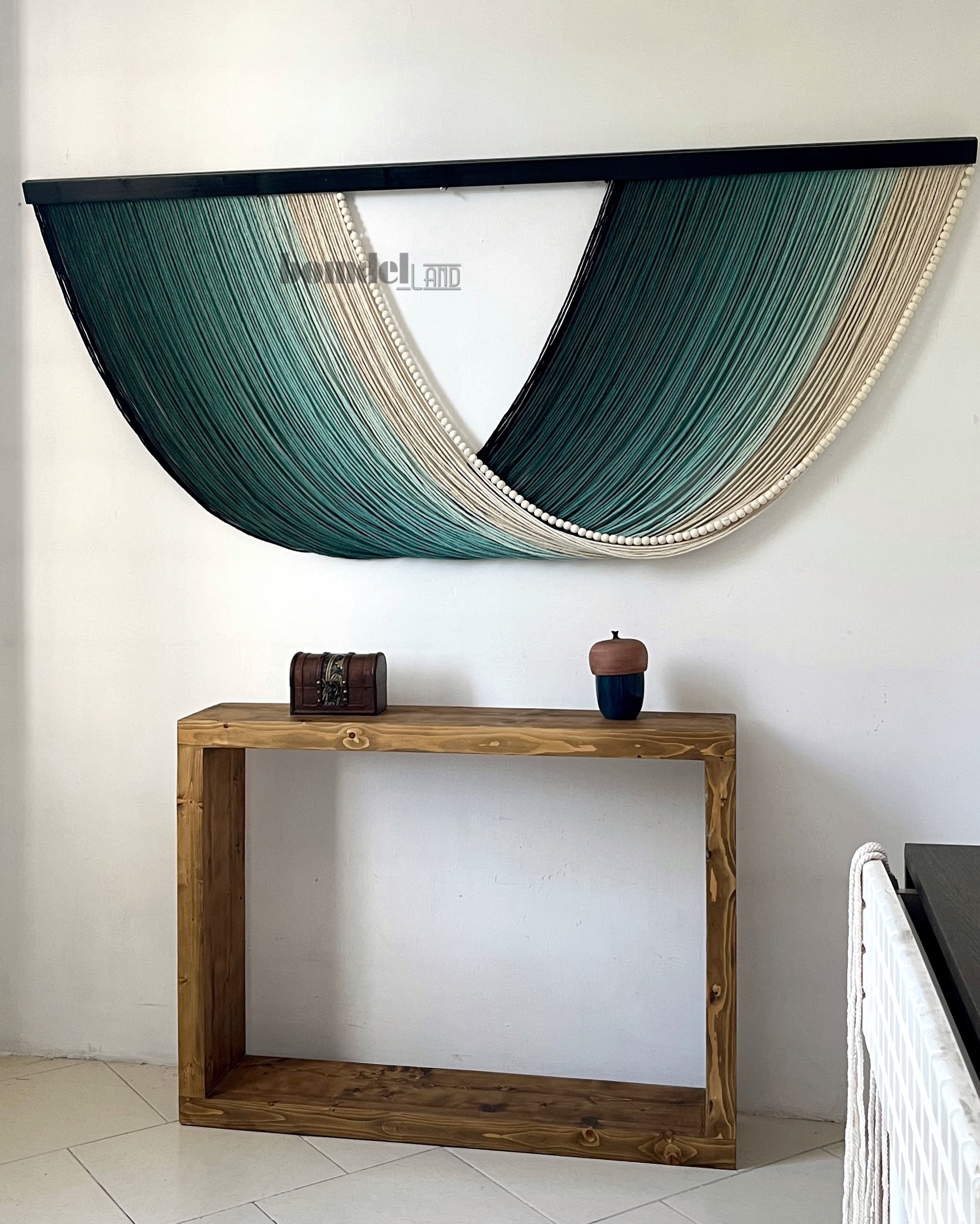 دیوارکوب دستساز کار شده با الیاف رنگرزی شده و چوب روس و مهره ی چوبی